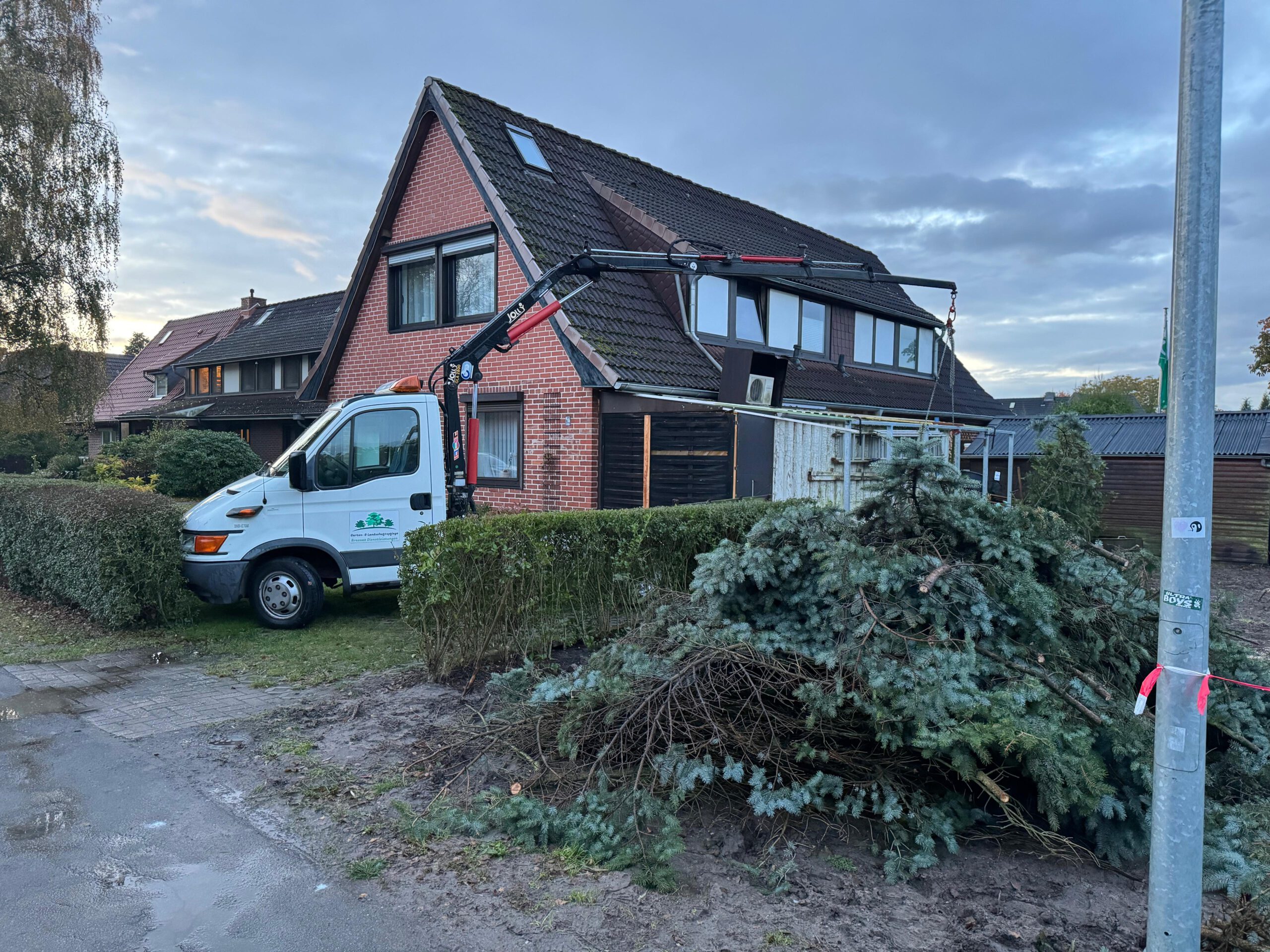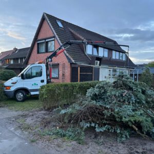 Präzise Kranarbeiten für individuelle Lösungen Mit unserem LKW-Aufbaukran heben wir schwere Bauteile mühelos über Hindernisse wie Hecken oder Zäune. Hier im Einsatz: Eine Stahlkonstruktion, die sicher an ihren Bestimmungsort gelangt.